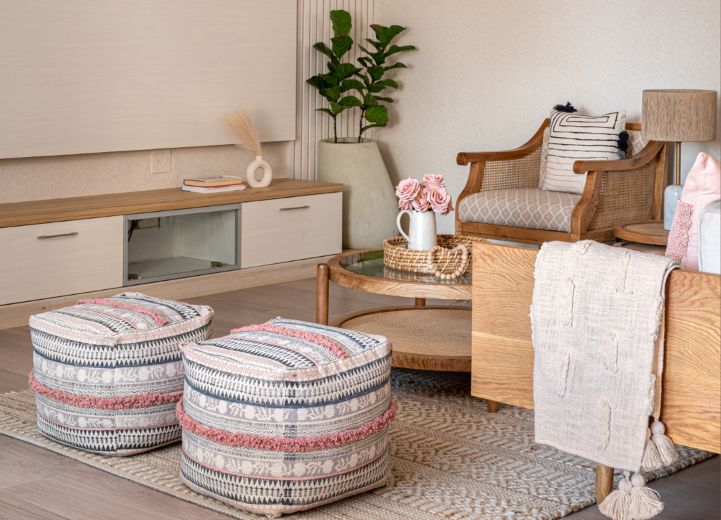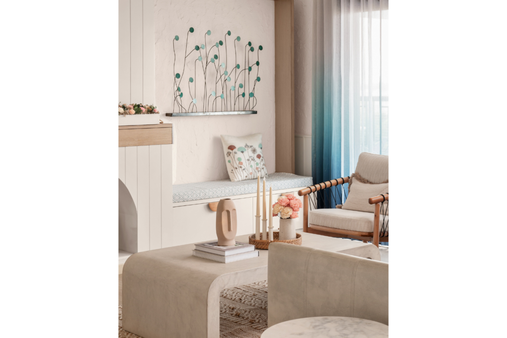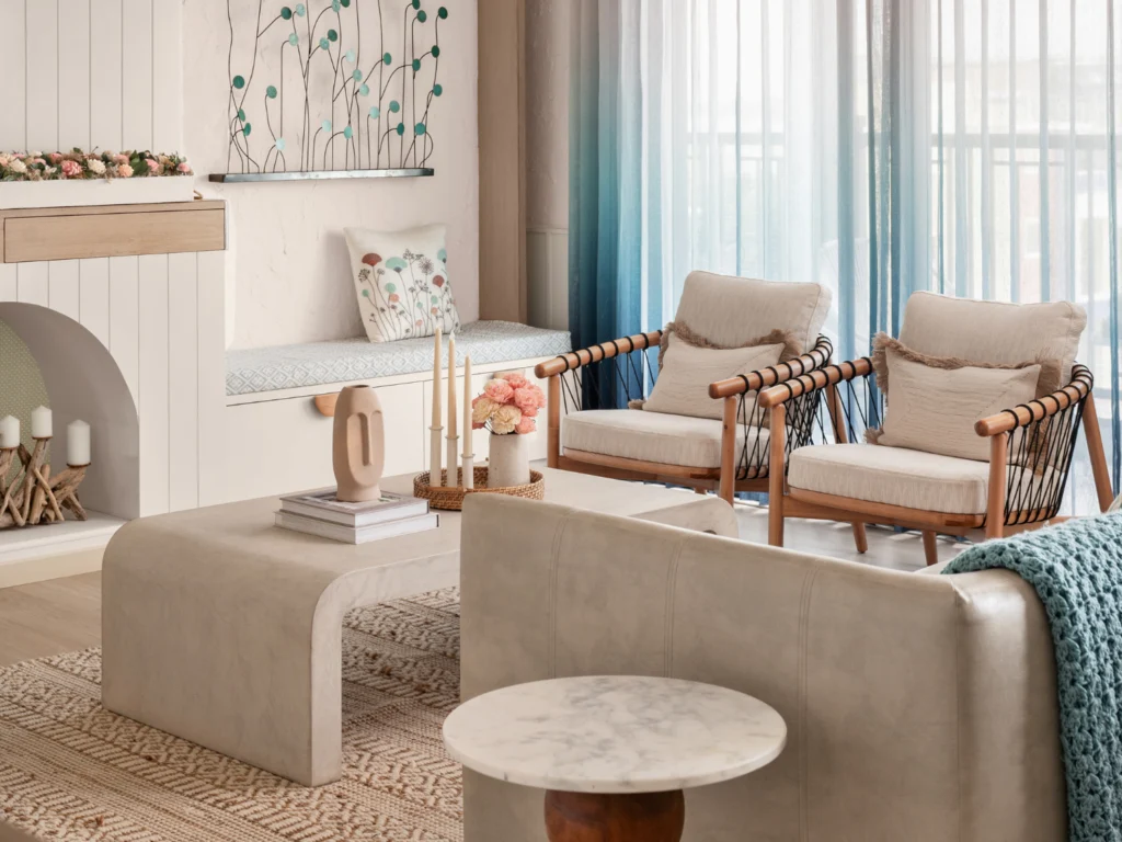 A calm and coastal escape in inspired by Mediterranean hues and soft textures, Mysa blends pastels, handcrafted elements, and thoughtful details to create a home that feels like a quiet retreat.
